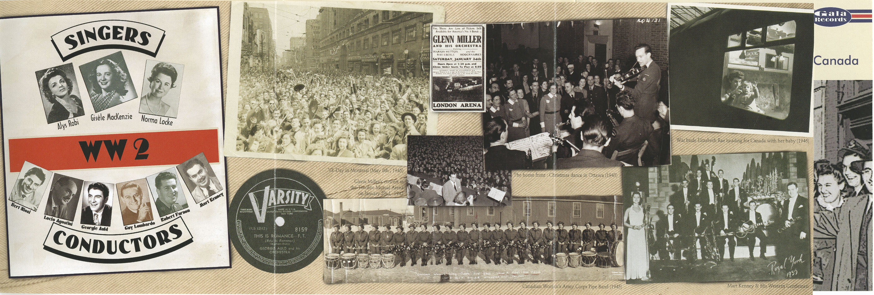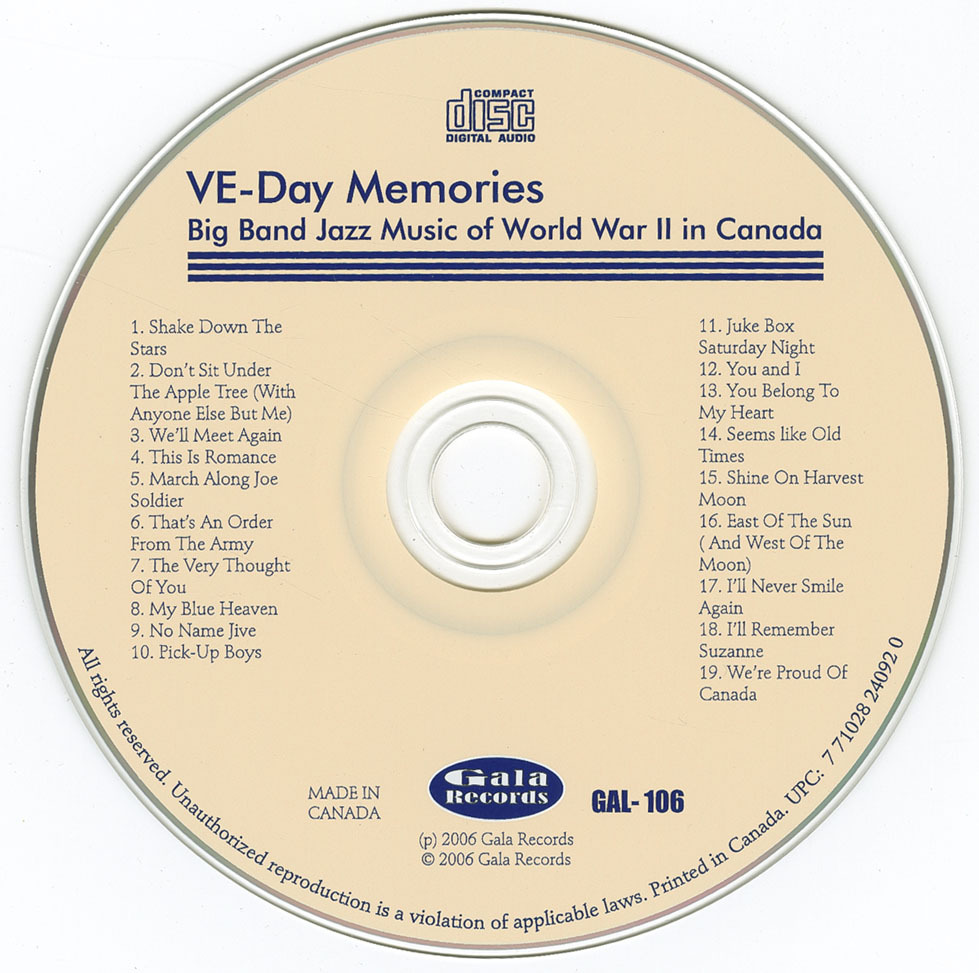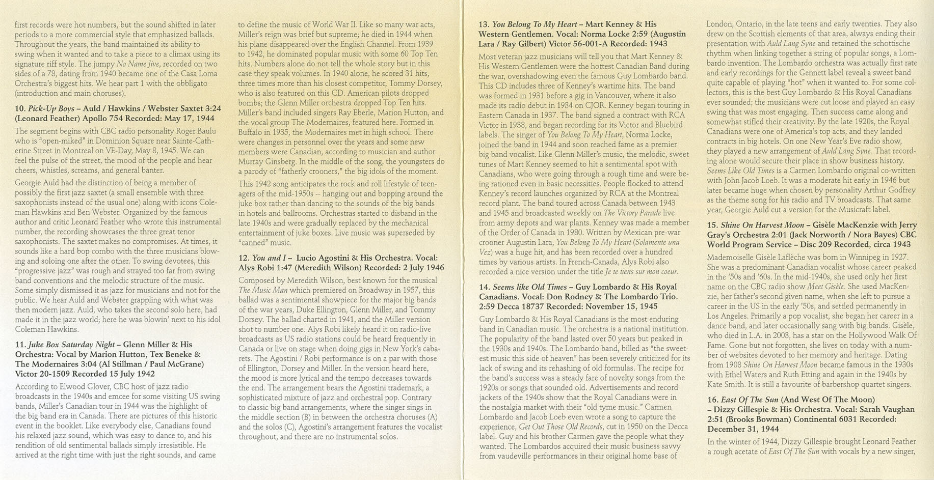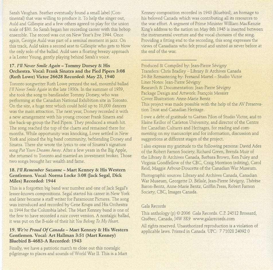 Finally, we have a patriotic march to close out this nostalgic pilgrimage to places and sounds of World War II. This is a Mart Kenney composition recorded in 1943 (Bluebird), an homage to his beloved Canada which was contributing all its resources to the war effort. A segment of Prime Minister William MacKenzie King’s address to the nation on May 8th 1945 is inserted between the instrumental overture and the vocal choruses of the song. Providing a fitting end to the recording, this song expresses the views of Canadians who felt proud and united as never before at the end of the war.