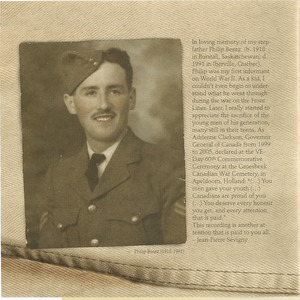 In loving memory of my step-father Philip Bentz (b. 1918 in Burstall, Saskatchewan; d. 1991 in Iberville, Québec). Philip was my first informant on World War II. As a kid, I couldn't even begin to under-stand what he went through during the war on the Front Lines. Later, I really started to appreciate the sacrifice of the young men of his generation, many still in their teens. As Adrienne Clarkson, Governor General of Canada from 1999 to 2005, declared at the VE-Day 60th Commemorative Ceremony at the Groesbeek Canadian War Cemetery, in Apeldoorn, Holland: "(...) You men gave your youth (...) Canadians are proud of you (...) You deserve every honour you get, and every attention that is paid."