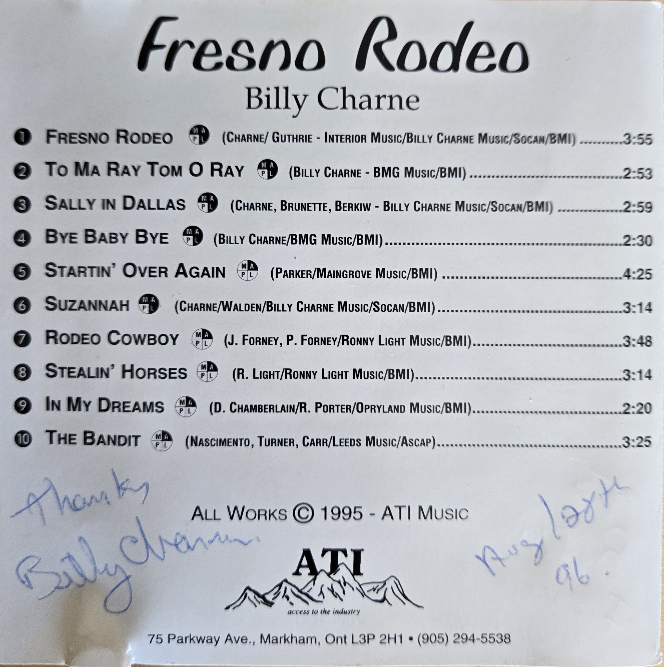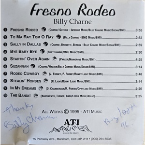 Sometimes the music business can take the music right out of an artist. But for Billy Charne, the music is an element so vital to who he is, that he continues to perform his art for the music’s sake. His latest album “Fresno Rodeo” is wonderfully produced and Charne’s vocal is as pleasing and comfortable as that of an old friend. It’s good travelling music for going up and down the road. It’s music to think to and to music to think about.