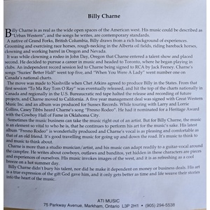 The move was made to Nashville when Chet Atkins agreed to produce Billy in the States. From that first session “To Ma Ray Tom O Ray” was eventually released, and hit the top of the charts nationally in Canada and regionally in the U.S. Bureaucratic red tape halted the release and recording of future projects, and Charne moved to California. A five year management deal was signed with Great Western Music Inc. and an album was produced for Sussex Records. While touring with Larry and Lorrie Collins, Casey Tibbs heard Charne’s song “Fresno Rodeo”. He had it nominated for a Heritage Award with the Cowboy Hall of Fame in Oklahoma City.