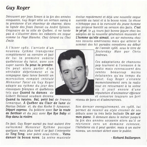 Découvert par Jean Simon à la fin des années cinquante, Guy Roger allie un certain swing à la prestance d’un chanteur de charme, dans la lignée des Yvan Daniel ou André Sylvain. Originaire de la ville de Québec, il ne tarde pas à s’illustrer dans les cabarets en vogue comme La Page Blanche, Chez Gérard ou Chez Émile.