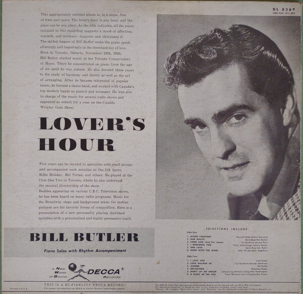 The skilled fingers of Bill Butler make the piano speak alluringly and lingeringly in the dialects understood by the heart. Born in Toronto, Ontario, November 23rd, 1927, Bill Butler studied music at the Toronto Conservatory of Music. Here he concentrated on piano, from the age of seven to the age of harmony and theory during the years of the study of harmony and theory until he was sixteen. He also devoted three years to arranging. After he became interested in all types of music, he formed a dance band, and worked with Canada’s top modern bands as pianist and arranger. He was also in charge of the score for several radio shows and appeared as soloist for a year on the Canadian Wrigley Gum Show.