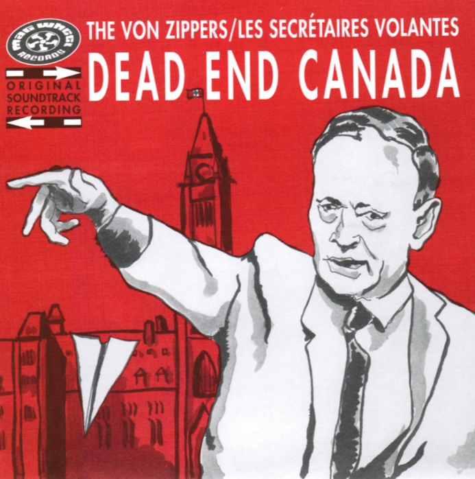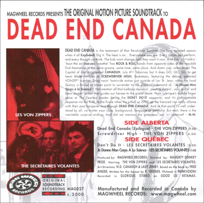 DEAD END CANADA is the testament of that Revolution Summer. The long awaited season when it all Exploded! Dig it: The heat is on… Everywhere you are. Every action you perform, and every thought you think. The kids want change, and they want it now. And they ain’t talkin’ bout the air that you breathed. Two ROCK & ROLL bands from opposite sides of the republic find themselves in the same groove, same time, same place. And damn you, some stage! The Capital of Our fragmented CANADUH, July #1! Tabarnac but it does GO, GO, GO to get here! Blade rumbles at SCREWDRIVER HIGH, Saskatoon, featuring the deluxe, patented VONZIP™ number. Drag racin’ homicide action just outside of Lac St. Jean, when late bloomer Quincy is forced at breast point to surrender to Ms. Cocktail’s soundtrack of “Je Donne Mon Corps à la Science”! Not mention all that kielbasa munchin’, poutine slurpin’, cole slaw spillin’ and brew slurpin’ action that guides our heroes to that final showdown and finale. From Lubrid’s middle finger to the poise of the Fearless Leader during the “DON’T DO IT” sequence, and it’s unforgettable passionate sex the Kids, to the finale when the reliable pied ZIPES set the frenzied riot really aflame with their post hangover tear through DEAD END CANADA. And at that point it’s well understood by all, no matter your class, background, language or portfolio. But wait, there is the inevitable surprise ending. And did we mention the gratuitous sex ‘n’ violence? – M.W.