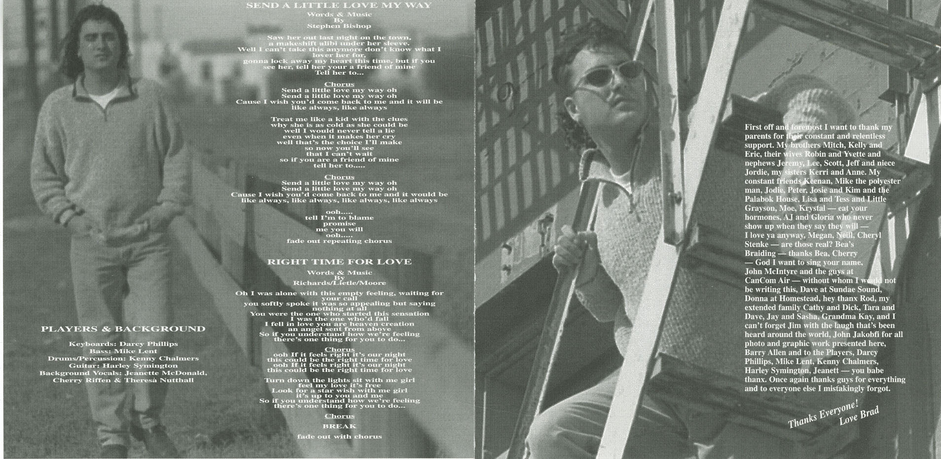 First off and foremost I want to thank my parents for their constant and relentless support. My brothers Mitch, Kelly and Eric, their wives Robin and Yvette and nephews Jeremy, Lee, Scott, Jeff and niece Jordie, my sisters Kerri and Anne. My constant friends Keenan, Mike the polyester man, Jodie, Peter, Josie and Kim and the Palabok House. Lisa and Tess and Little Grayson, Moe, Krystal — eat your hormones, Al and Gloria who never show up when they say they will — I love ya anyway, Megan, Neil, Cheryl Stenke — are those real? Bea’s Braiding — thanks Bea, Cherry — God I want to sing your name. John McIntyre and the guys at CanCom Air — without whom I would not be writing this. Dave at Sundae Sound, Donna at Homestead, they hang dear, Rod, my extended family Cathy and Dick, Tara and Dave, Jay and Sasha, Grandma Kay, and I can’t forget Jim with the laugh that’s been heard around the world, John Jakobfi for all photo and graphic work presented here, Barry Allen and to the Players, Darcy Phillips, Mike Lent, Kenny Chalmers, Harley Symington, Jeanett — you babe thanx. Once again thanks guys for everything and to everyone else I mistakingly forgot.