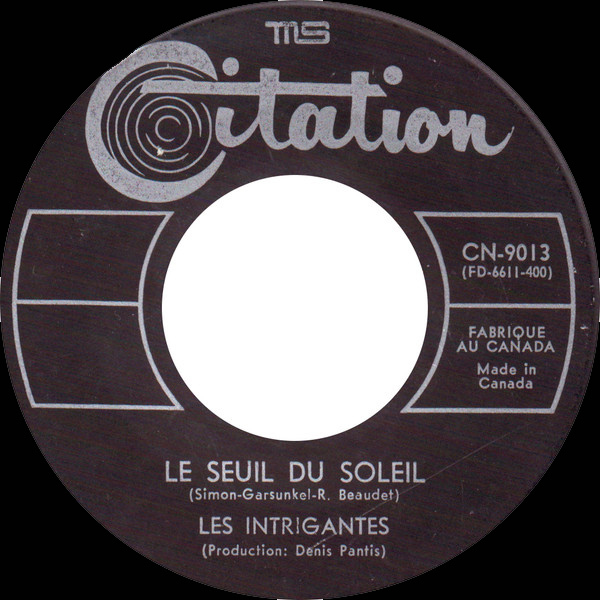 The following year saw the band record ‘Mets chinois’ b/w ‘Le seuil du soleil’ for Citation Records. The A-side continued their collaboration with Beaudet, while the B-side offered a French-language adaptation of Simon and Garfunkel’s ‘The Sound of Silence’, signalling Les Intrigantes’ growing role as interpreters of contemporary folk-rock material for francophone audiences.