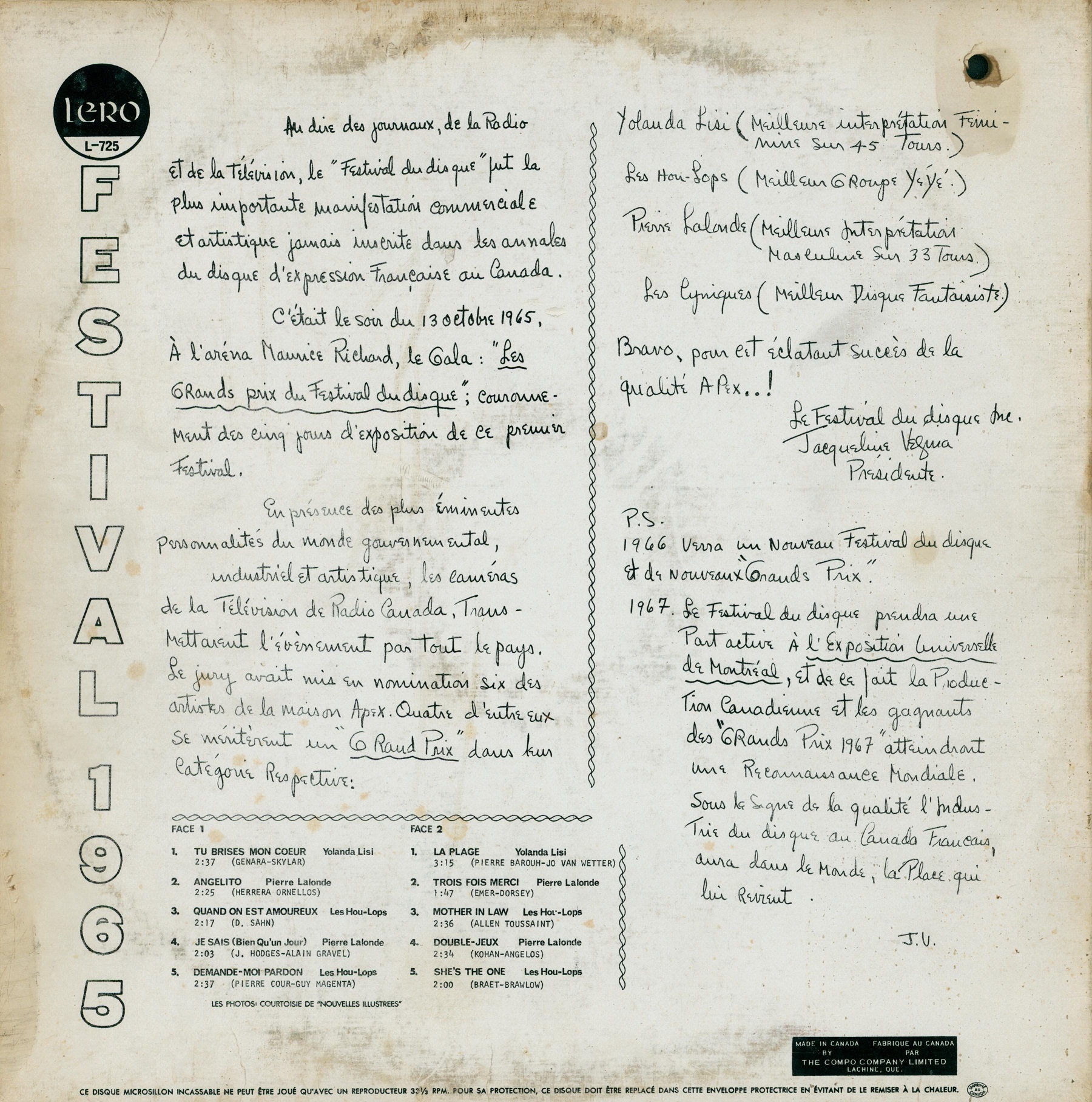 Les Grands Prix du disque - Festival 1965 Back cover