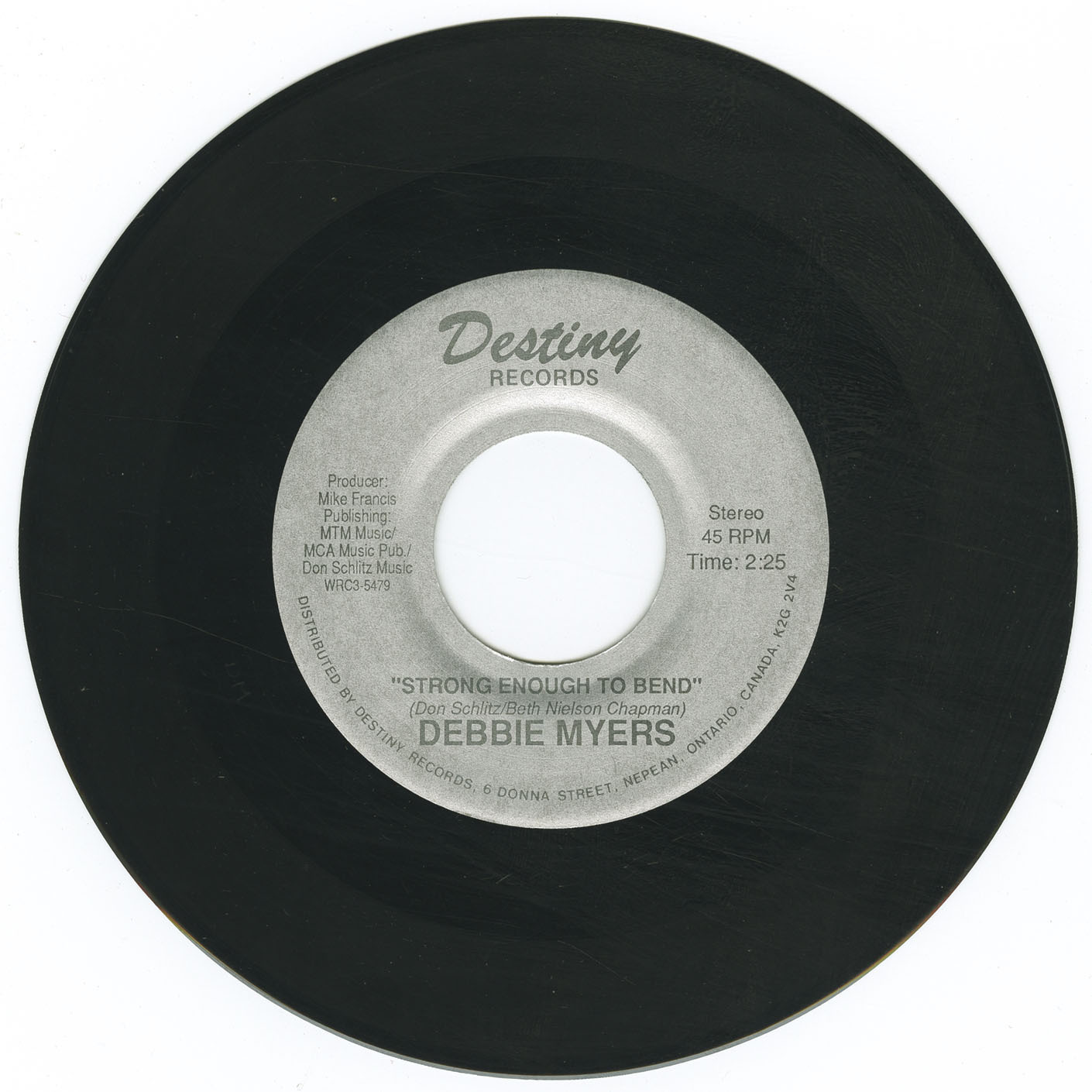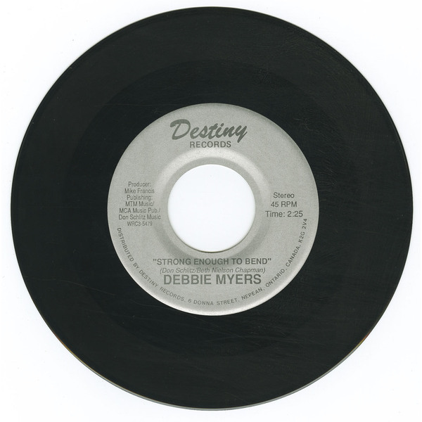 Her breakthrough came in 1989 with the Destiny Records single “Strong Enough to Bend.” Written by Nashville hitmakers Don Schlitz (“The Gambler”) and Beth Nielsen Chapman, the track was produced by three-time Canadian Producer of the Year Mike Francis, who also played guitar and mandolin. The studio lineup was exceptional: Barry Keane (longtime Gordon Lightfoot drummer), Ron Dann (steel/dobro), Ron Boroughs (keyboards), Kim Brant (bass), Jim Pirie (acoustic guitar), and backing vocals by celebrated Canadian singers Judy Tate (mother of Emilie-Claire Barlow, member of the Laurie Bower Singers) and Stephanie Taylor (of The Willows, and the cult solo album I Don’t Know Where I Stand). The single became a Top 10 Canadian country hit, staying on the charts for over 16 weeks. Shortly afterward, the song was picked up by Tanya Tucker, who turned it into an international No. 1, underscoring Myers’ role in helping launch a country standard.