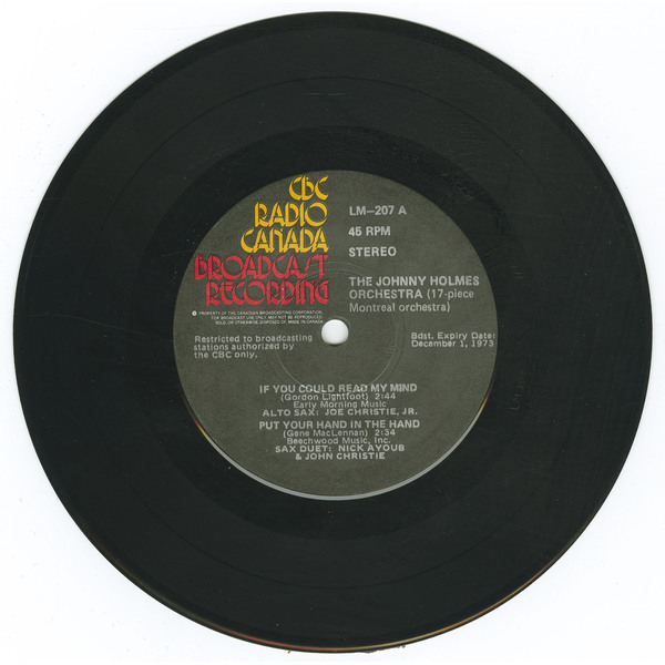 After retiring from music in 1951, Holmes returned in 1959 to front orchestras for CBC Radio. Throughout the 1960s he was heard regularly on programs like The Johnny Holmes Show and Broadway Holiday, blending Broadway sparkle, light music, and jazz into a polished orchestral style. Between 1966 and 1973 he recorded a total of six broadcast-only albums and singles for the CBC’s LM (Light Music) series. These were pressed in tiny quantities and distributed in plain stock sleeves, never sold commercially. Among them were two sought-after LPs — Johnny Holmes Orchestra – Ray Berthiaume and Margo McKinnon, vocalists (CBC LM-16, 1966) and Johnny Holmes Orchestra – Ray Berthiaume, vocalist (CBC LM-29, 1967). He then experimented with a brass-heavy ensemble under the name Brass Therapy, recording CBC LM-164 (1971, released 1973) with “Close to You,” “So Nice,” “Wave,” and “Lollipops and Roses,” and CBC LM-192 (1972), featuring For Once in My Life (arranged by Holmes), Love Story (trombone feature for Claude Blouin), Watch What Happens (guitar feature for Tony Romandini), and Lonely Is the Name. In 1972 Holmes also cut CBC LM-207, a 45 pairing Gordon Lightfoot’s “If You Could Read My Mind” and Gene MacLellan’s “Put Your Hand in the Hand” with his own composition “Rainbow” and MacLellan’s “The Call.” His final entry came with CBC LM-266 (1973), a 45 featuring “Si tu parais” and “Alouette.”