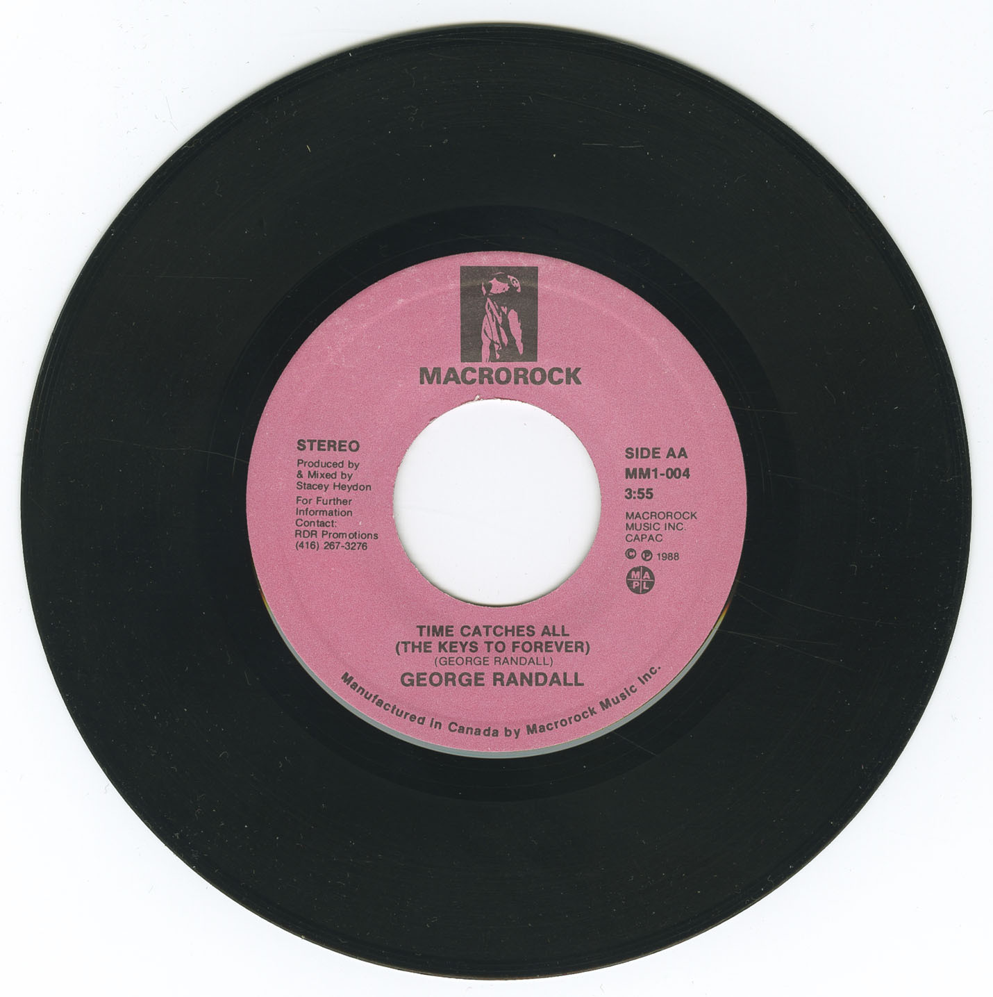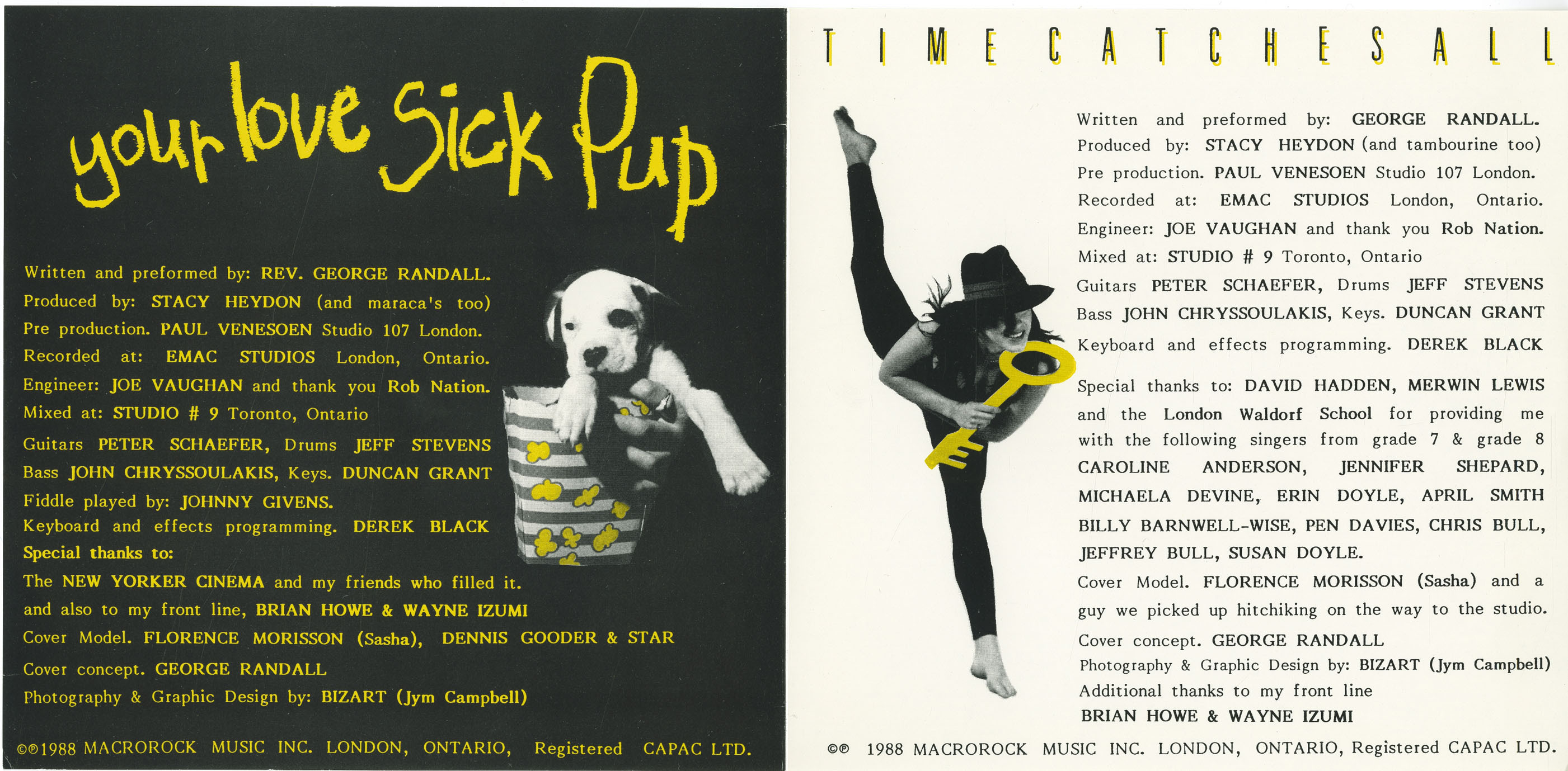 Randall followed in 1988 with Your Love Sick Pup b/w Time Catches All (The Keys to Forever), produced by Stacy Heydon, the noted Canadian guitarist and producer who had toured with David Bowie during the Station to Station era and later worked with Iggy Pop. Recorded again at EMAC, the single showcased a more polished pop-rock sound, augmented by fiddle player Johnny Givens, keyboardist Duncan Grant, programmer Derek Black, and choir vocals from students at the London Waldorf School. Each release displayed Randall’s meticulous attention to credits, artwork, and local collaboration, often listing every musician, studio, and even participating school by name—a level of transparency rare among independent artists of the period.