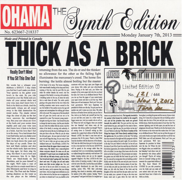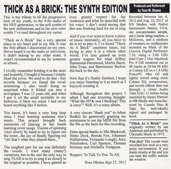 "Thick as A Brick" has a very special place in my heart and in my life. It was the first album I discovered on my own. Never heard it on the radio or television, it didn't belong to my older sister, it wasn't recommended to me by someone at school...
