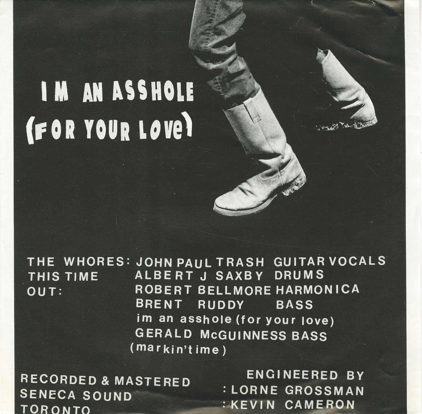 Their first release, the 1985 7" “Marking Time / I’m an Asshole (For Your Love)”, introduced the Whores’ mix of country-rock swagger and punk bite. But it was their self-titled 1989 LP—recorded at Umbrella Sound—that fully captured what the band valued most: energy, honesty, and a live-off-the-floor performance aesthetic. In a handwritten insert addressed informally to listeners (“Howdy”), the band explained their refusal to pursue polished, big-budget studio production. Instead, they worked with producer Jim Guess to track the core instruments live, preserving “the energy and detail of the performance.”