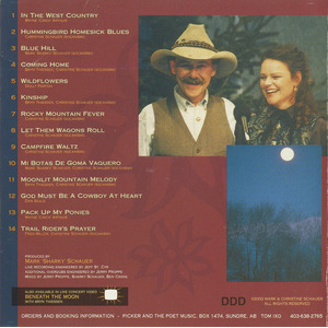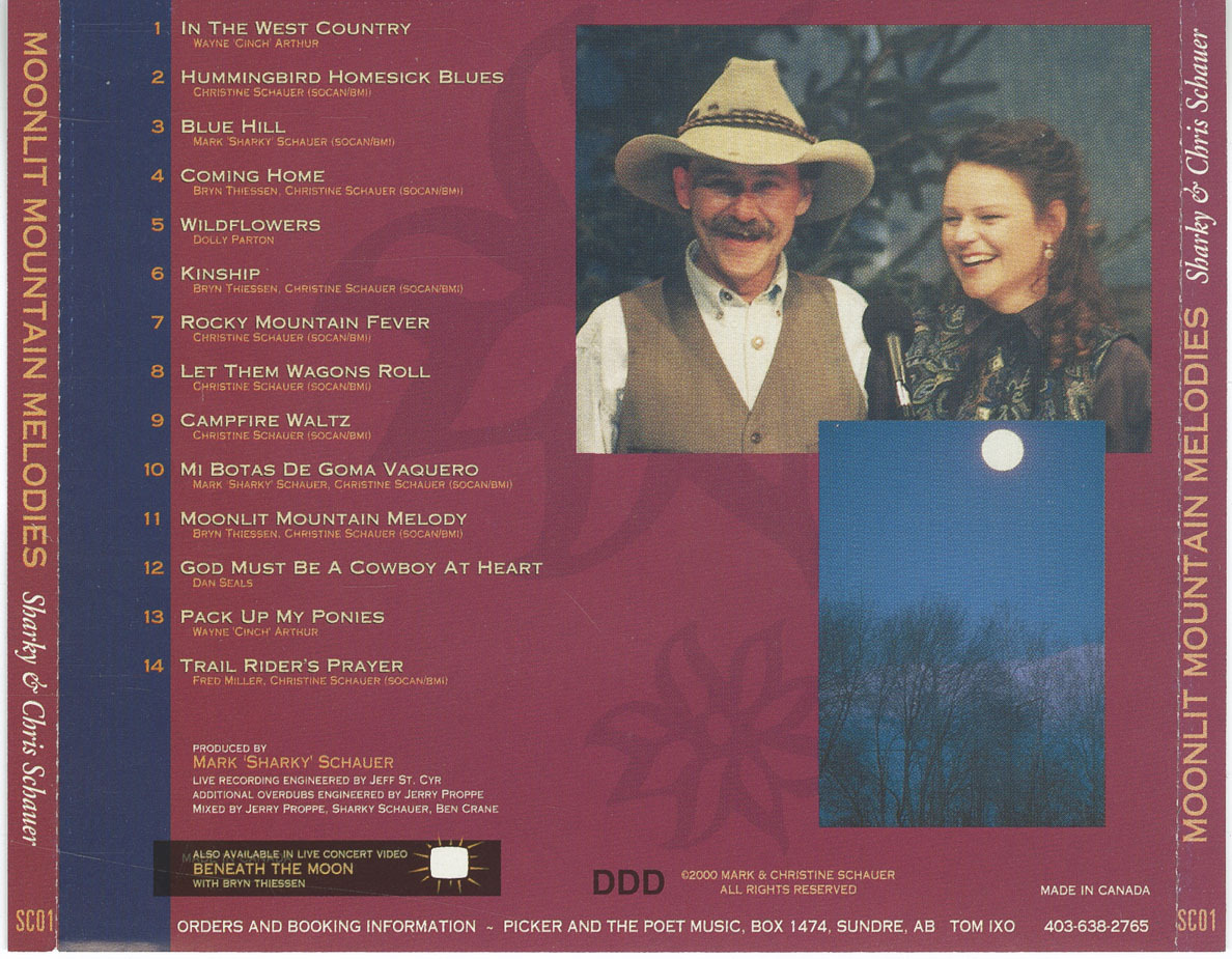 Mark “Sharky” Schauer and Christine Schauer are part of the West Country music tradition that runs through Sundre, Alberta—an area shaped by foothill ranching, cowboy poetry, and small-town gatherings where songs travel from one campfire to the next. Their writing springs directly from that landscape: Weasel Hill, Hummingbird Creek, the Ram River country, and the community of ranch families and musicians who anchor the region. Moonlit Mountain Melodies (2000) reflects those ties, with contributions from close collaborators Butch Falk, Ben Crane, and Bryn Thiessen, and with a special nod to Wayne “Cinch” Arthur, one of the area’s most respected cowboy storytellers and songwriters. The Schauers include two of his compositions—“In the West Country” and “Pack Up My Ponies”—songs Arthur first recorded himself during his Sundre years, including his own version of “In the West Country” on his 1976 LP Alberta Gold. By bringing those songs into their repertoire, Sharky and Chris place themselves squarely within the living, passing-hand-to-hand tradition of Cowboy Trail music, where local stories move between generations and settle into new voices. https://citizenfreak.com/titles/265762-arthur-wayne-cinch-alberta-gold