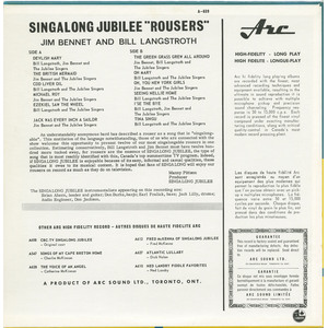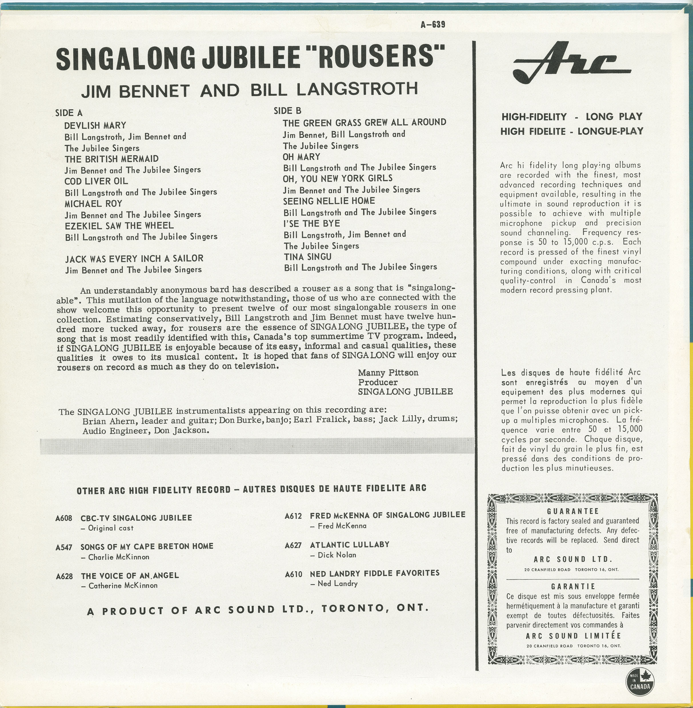 An understandably anonymous bard has described a rouser as a song that is “singalong-able”. This mutilation of the language notwithstanding, those of us who are connected with the show welcome this opportunity to present twelve of our most singalongable rousers in one collection. Estimating conservatively, Bill Langstroth and Jim Bennet must have twelve hundred more tucked away, for rousers are the essence of SINGALONG JUBILEE, the type of song that is most readily identified with this, Canada’s top summertime TV program. Indeed, if SINGALONG JUBILEE is enjoyable because of its easy, informal and casual qualities, these qualities it owes to its musical content. It is hoped that fans of SINGALONG will enjoy our rousers on record as much as they do on television.