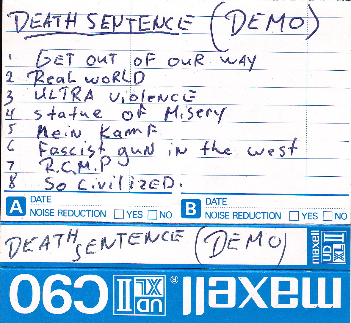 The original lineup featured vocalist and guitarist Pete “Puke” Keller (also known as Pete Cleaver), guitarist Syd Savage, bassist Tim Challenger, and drummer Doug “Donut” Proulx. Death Sentence gained immediate notoriety following a near-riot at Vancouver’s 1984 Shindig battle of the bands, where they placed second after a chaotic performance that included a beer can striking the master of ceremonies. Using their winnings, the band recorded an early demo that captured their raw, confrontational sound and introduced several songs that would later reappear in more developed form.