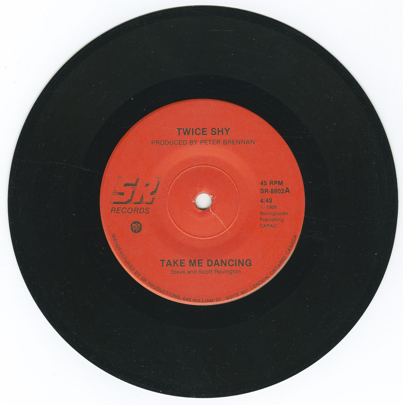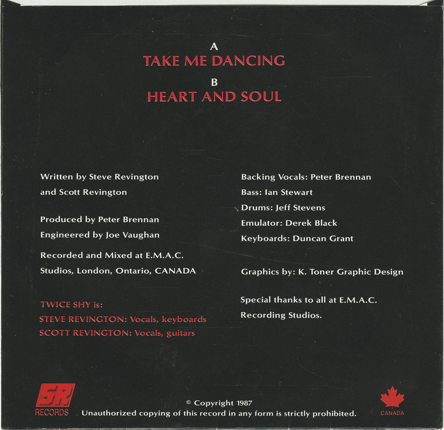 In 1987, Twice Shy released the single ‘Take Me Dancing’ b/w ‘Heart and Soul’, recorded and mixed at E.M.A.C. Studios. The record was produced by Peter Brennan, with engineering by Joe Vaughan, and featured contributions from local musicians including Ian Stewart (bass), Jeff Stevens (drums), Derek Black (emulator), Duncan Grant (keyboards), with Brennan also providing backing vocals. The single represented the duo’s most fully realized studio work, capturing their polished synthesis of pop structure and progressive influence.