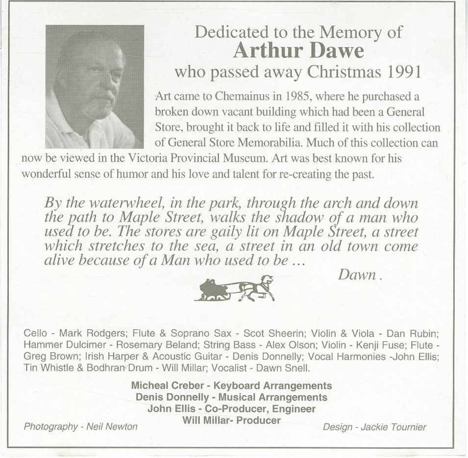 Dawn Snell came from Calgary, Alberta in 1983 and was enchanted with the Crofton-Chemainus Valley. Singing has always been a part of Dawn’s life. I’m glad she was able to fulfill a wish here at Melodeon Studios in memory of her friend, Arthur Dawe who passed away Christmas ’91. Here is her gift for your Christmas Spirit.
