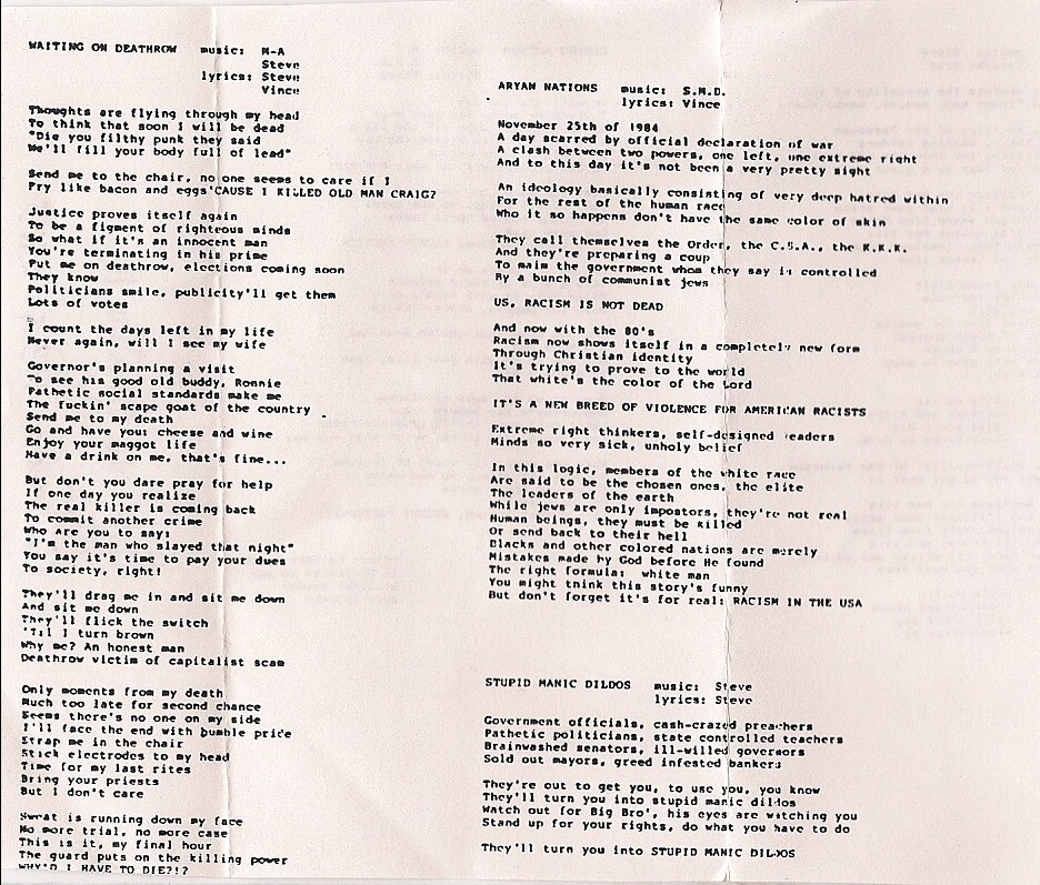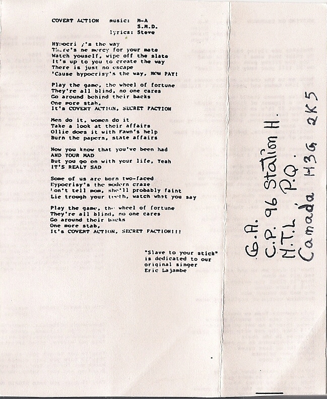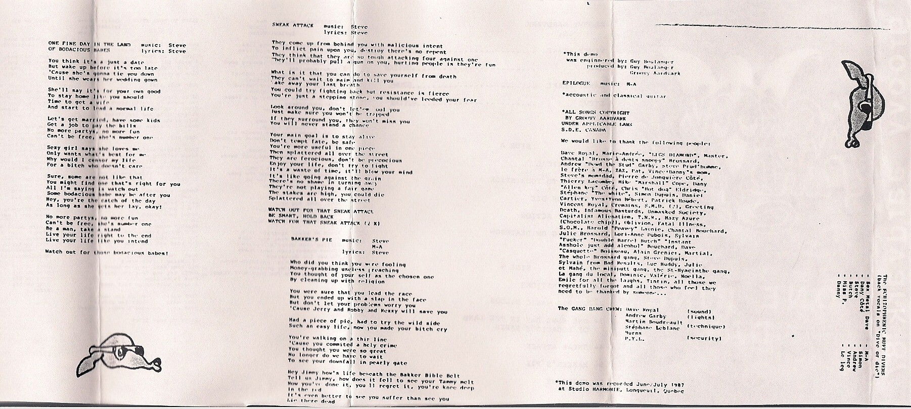 The group documented its formative years through a series of self-released cassette demos recorded between 1987 and 1991, including One Fine Day (1987) and The Late Race to Zero (1991). These recordings capture a raw, exploratory phase marked by long-form compositions, aggressive dynamics, and a strong progressive undercurrent that set them apart from conventional punk or metal acts circulating in Quebec at the time. The demo period also coincided with heavy live activity, cementing the band’s reputation for intense, unpredictable performances.