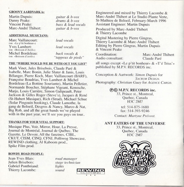 Groovy Aardvark’s first full-length album, Eater’s Digest (1994), marked a turning point. Recorded and produced with a more focused approach, the album presented a sharpened alternative-rock sound while retaining the band’s off-kilter structures and abrasive edge. Songs like “Ants Have No Chance” revealed a growing interest in social systems, conformity, and control—themes that would recur throughout the band’s catalogue. The album established Groovy Aardvark as a rising force within Quebec’s alternative scene.