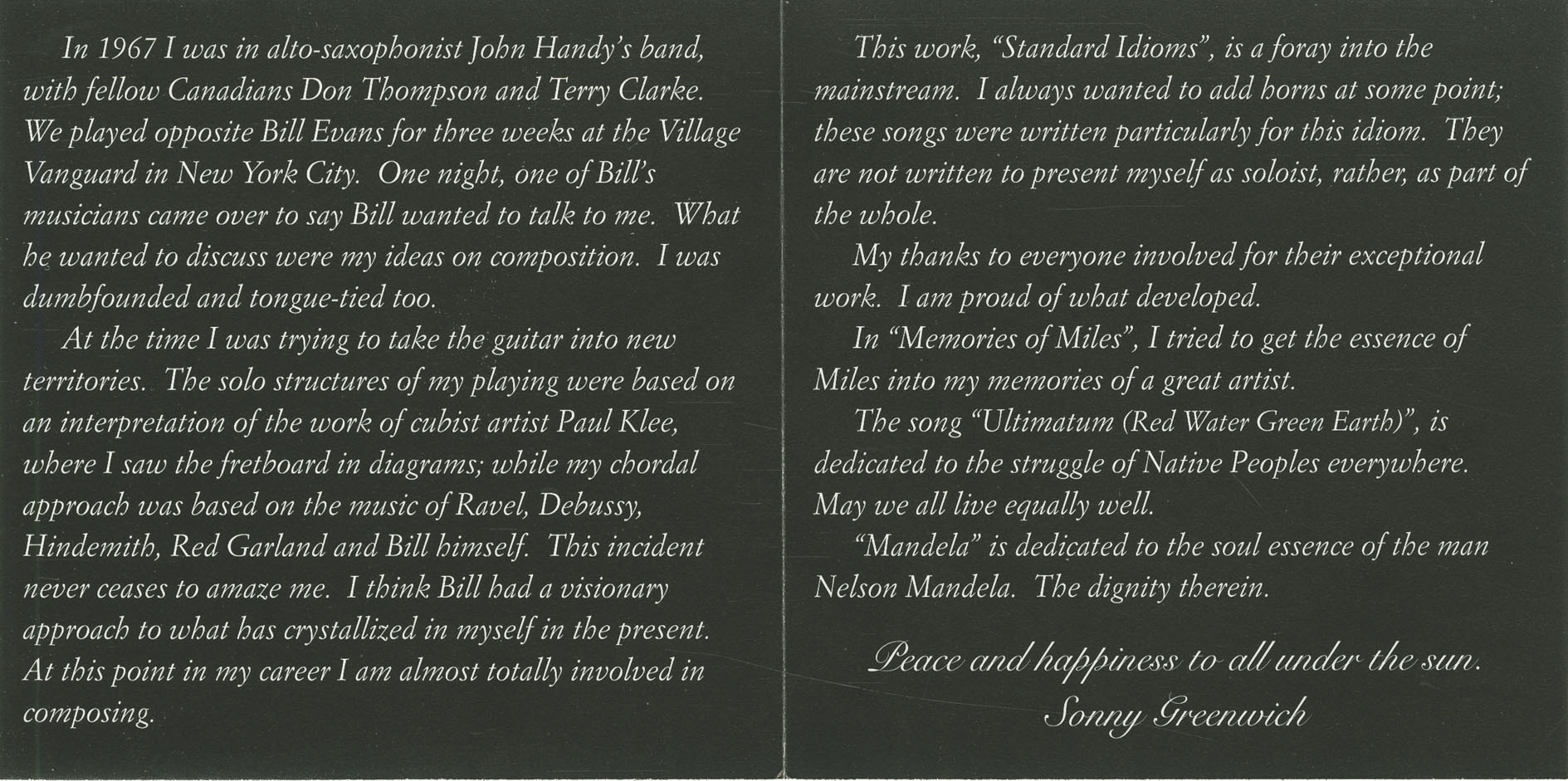 From the beginning, Greenwich was a seeker—not just of musical style, but of spiritual and emotional truth. His influences spanned far beyond jazz: from classical composers like Ravel, Debussy, and Hindemith, to abstract painters like Paul Klee, to the human voice itself, particularly the expressive phrasing of Maria Callas. His chordal ideas were as likely to be shaped by visual art or literature as by other guitarists. "The solo structures of my playing were based on an interpretation of the work of cubist artist Paul Klee, where I saw the fretboard in diagrams," he said. Even in his youth, he was drawn to statements by Charlie Parker about the value of classical music, and pursued similar paths of study.