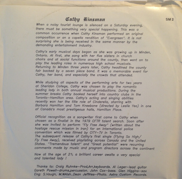 Official recognition as a songwriter first came to Cathy when chosen as a finalist in the 1979 CFTR talent search. Soon after she was invited to perform “Fly Free Away” (written about the hostage rescue mission in Iran) for an international police convention which was filmed by CITY-TV in Toronto. The subsequent release of Cathy’s first single (Flying So High / Fly Free Away), received playlisting across Canada and the United States. “Tremendous talent” and “Great potential” were recurring comments made by music and program directors across the continent.