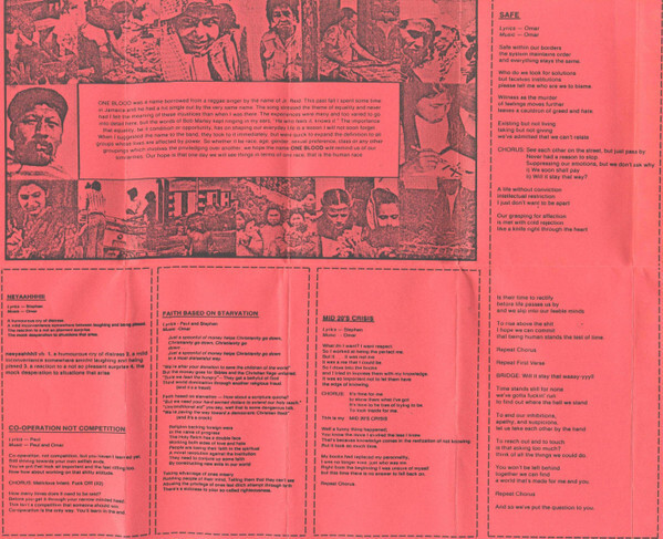 Later that year, One Blood made their vinyl debut with a self-titled 7-inch EP on Lobotomy Exchange Records. Recorded in Toronto, the EP was issued in a foldover lyrics sleeve and packed more than fifteen minutes of music onto a single disc.