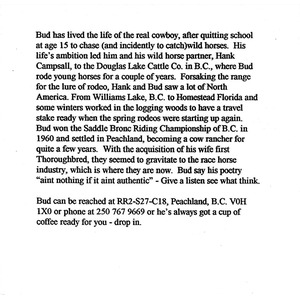 After settling in Peachland, British Columbia, Bud worked as a rancher for several years. Eventually he and his wife Frances became involved in the Thoroughbred horse industry, but horses — and the culture around them — remained central throughout his life.