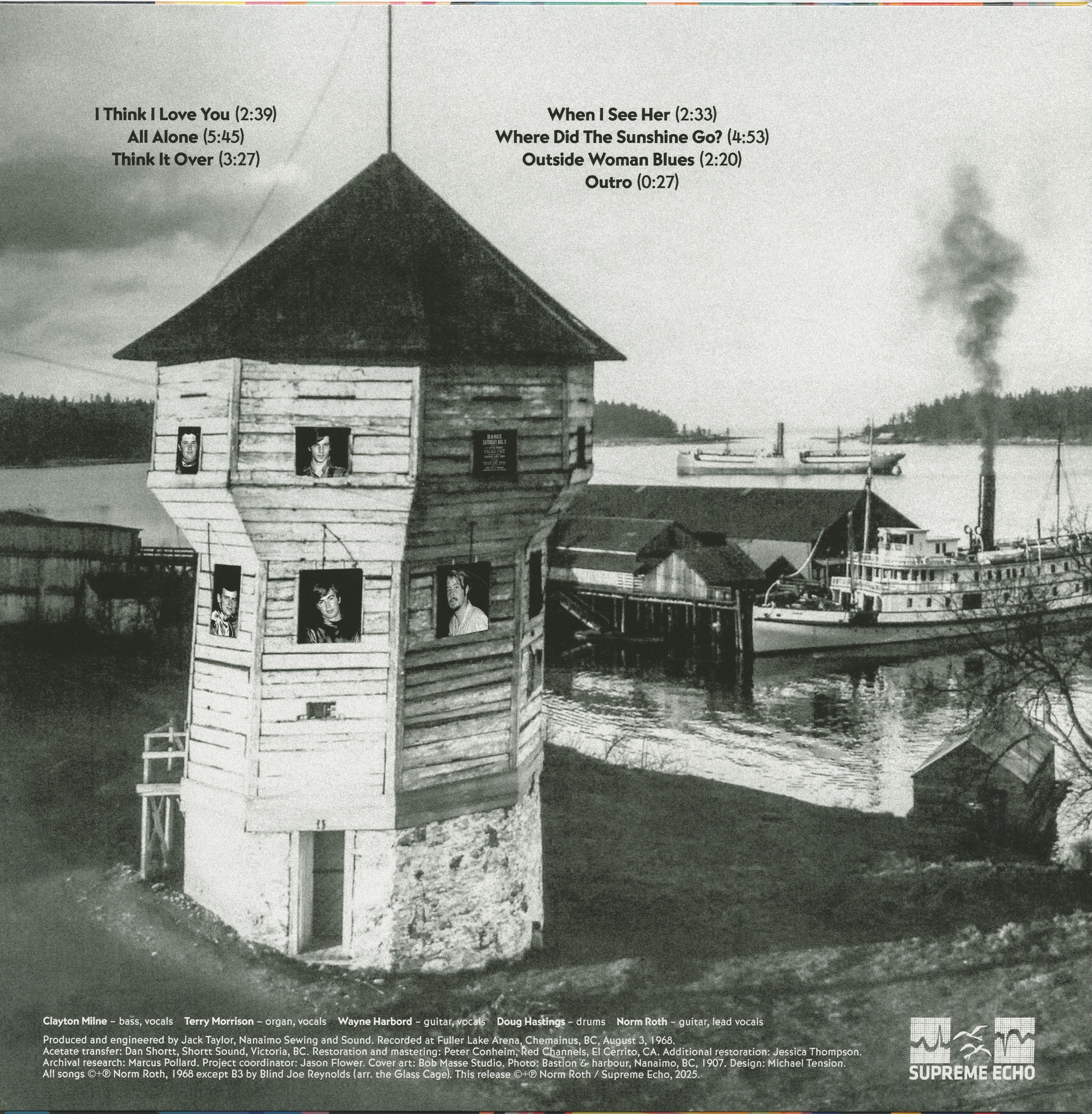 In the summer of 1968, five Nanaimo teenagers — Norm Roth (vocals, guitar), Wayne Harbord (lead guitar), Clayton Millan (bass), Terry Morrison (organ), and Doug Hastings (drums) — recorded a live performance at the grand opening of Fuller Lake Arena in Chemainus, British Columbia. The recording took place on Saturday, August 3, 1968 — the same weekend the Newport Pop Festival was unfolding in Southern California. The set was captured by local audio retailer Jack Taylor (“Pop”), owner of Sewing & Sound on Nanaimo’s Commercial Street, using reel-to-reel machines and a simple two-microphone setup. Taylor, a sewing machine dealer who quietly transferred new LPs onto 8-track cartridges for teenagers cruising Nanaimo in Chargers and Mustangs, ran cables across the arena floor and mixed the entire band down to a single channel. There was no rehearsal, no level check — just one take.