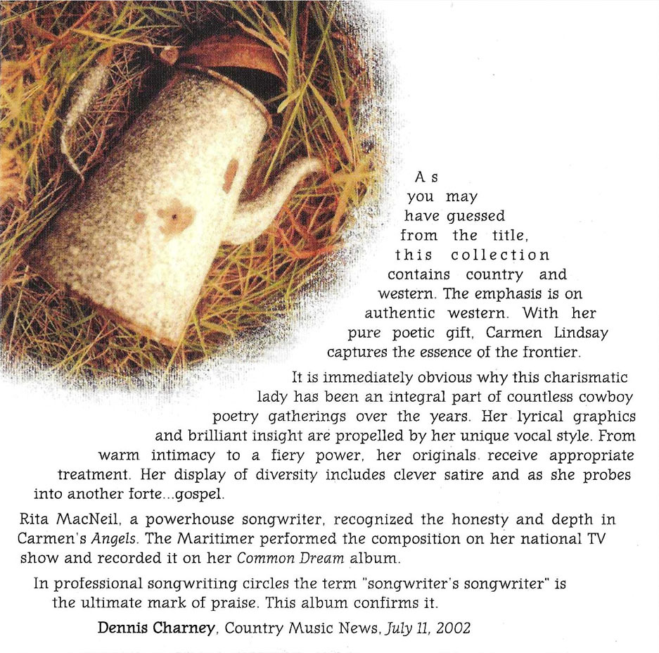 Rita MacNeil, a powerhouse songwriter, recognized the honesty and depth in Carmen's Angels. The Maritimer performed the composition on her national TV show and recorded it on her Common Dream album.