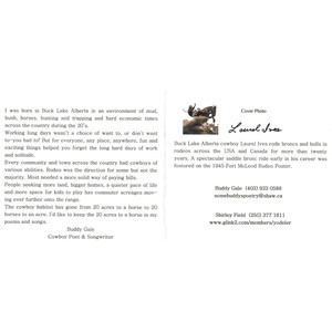 Buddy Gale was 12 years old when he jumped a freight, riding boxcar walkways to cowboy on the ranches of southern Alberta. In 1948 Buddy’s careers turned to trucking, logging and pipelining, but he never forgot the details of his life as a Cowboy. A Cowboy Poetry gathering in 1992 inspired Buddy’s poetry that showcases the authentic Cowboy. Almost a hundred of his poems have been put to music, by a score of artists.